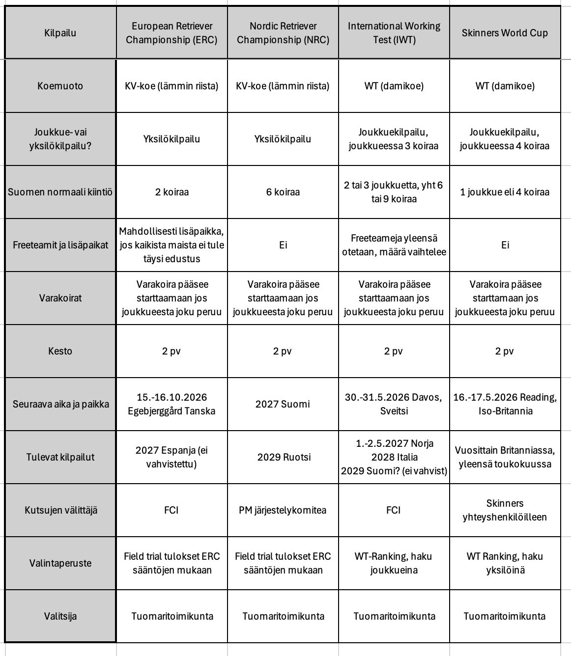Koontitaulukko kansainvälisistä tulevista kilpailuista.