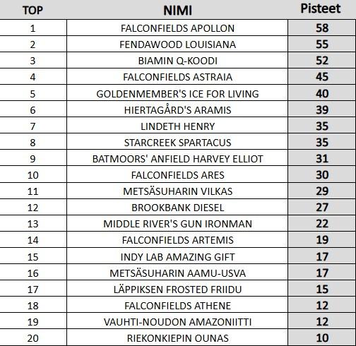 Koirakoiden pistelaskutaulukon tulokset alkaen 10.08.2023