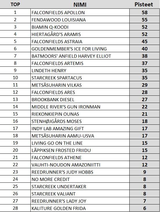 Tuomaritoimikunta ylläpitää NOME A ja KV-kokeiden tulosten perusteella ranking-listaa, josta selviää koirakohtaiset pisteet.